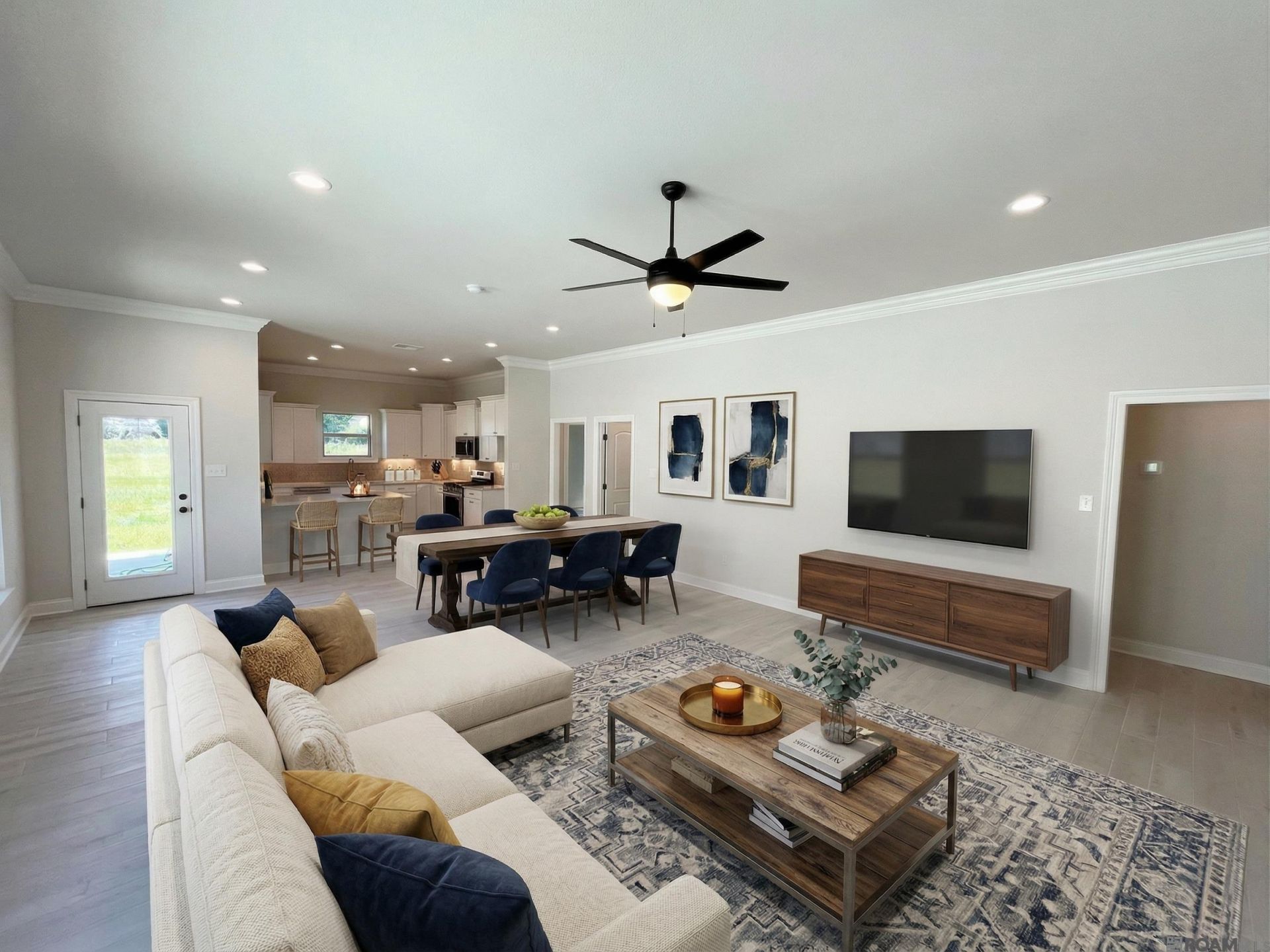 Fencing addition at no extra cost to buyer. The ALFANI III A in Atwater Villas community offers a 4 bedroom, 2 full bathroom, open design. The community is nestled along the scenic River Road and features pond lots, walking trails, future pickleball courts, and common areas. Features: double vanity, garden tub, separate shower, and a large walk-in closet in the primary suite, the primary closet goes through to the laundry room for added convenience, tray ceiling in the primary bedroom, double vanity in the second bathroom, a breakfast bar, large walk-in pantry, covered rear patio, side-entry garage, recessed can lighting, undermount sinks, cabinet hardware throughout, ceiling fans in the living room and primary bedroom are standard, custom framed mirrors in all bathrooms, smart connect wi-fi thermostat, smoke and carbon monoxide detectors, post tension slab, automatic garage door with 2 remotes, landscaping, architectural 30-year shingles, flood lights, and more! Energy Efficient Features: a tankless gas water heater, a kitchen appliance package, low E tilt-in windows, and more!